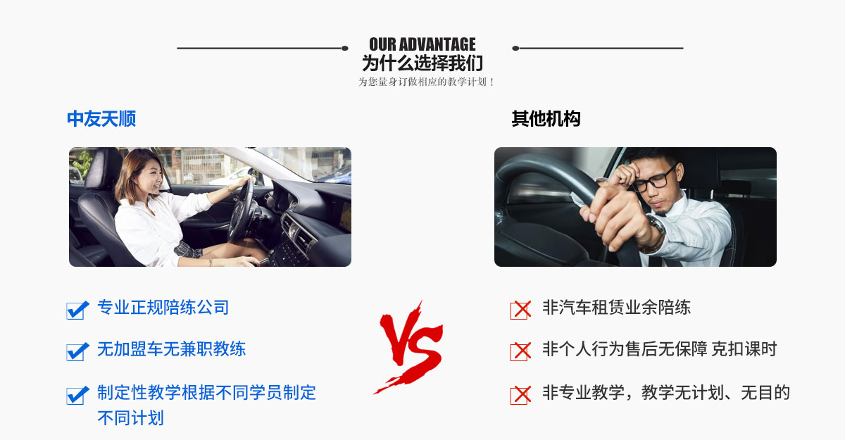 北京中友天順汽車陪練隸屬于北京中友天順汽車技術(shù)有限公司一家專業(yè)的汽車陪練公司,公司秉承宗旨:為已有駕駛本而不能夠在實(shí)際道路上安全行駛的駕駛員而服務(wù)的,我們大力宣揚(yáng)道路安全駕駛理念,深度提高駕駛員駕駛技術(shù),為首都駕駛員的安全駕駛技術(shù)和安全駕駛意識服務(wù).從而減少首都道路的涌堵,減少首都交通事故的發(fā)生。針對不同開車基礎(chǔ)的學(xué)員制定各種培訓(xùn)方案!誠信、專業(yè)、周到!北京中友天順汽車陪練公司全部為部隊(duì)轉(zhuǎn)業(yè)軍人,駕齡都在十五年以上,